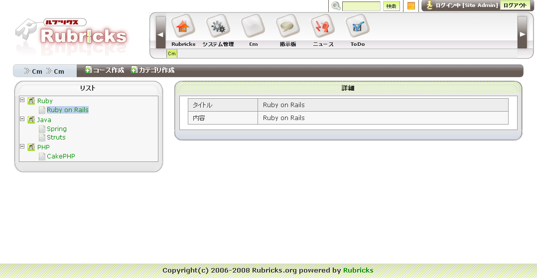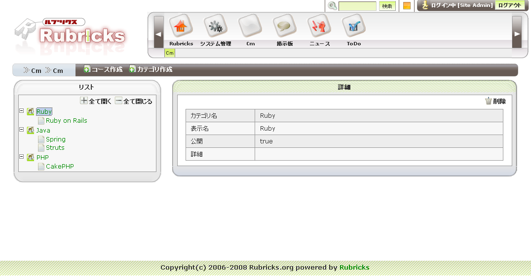 カテゴリとコースをツリー表示し、クリックすると詳細表示できるようにしました。 2008年6月20日~23日 (Lonely Lion2 Site) 詳細表示はまだコース名と表示名しか表示されません。 気づいたらカテゴリが作成できなくなっていました。 原因は、 course を course_category に変更していなかったから。 コピペして直すの忘れてました。 |