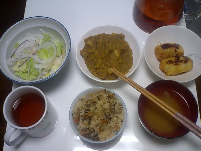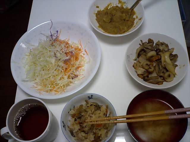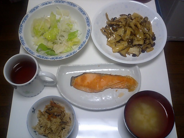 というわけで、晩御飯のバランスを良くしました。 ・ホタテの炊き込みご飯 ホタテにはタウリン、ステロールが含まれています。 母が送ってくれました。 ・鮭 北海道産の鮭です。 これも送ってくれました。 やっぱり実家で獲れた魚は脂がのっていて美味しいです。 ・大根サラダ 水溶性食物繊維が含まれています。 大好きなマヨネーズは使わずに、トマト酢ドレッシングを少なめにかけて食べます。 ・シジミの味噌汁 シジミも魚介類なので、タウリンとステロールが含まれているはず。 ・キノコ炒め これは自分で作りました。 ブナシメジとエリンギを食べやすい大きさにして、みりんと醤油で炒めただけです。 思いついて作ったんですが、これでまずいわけがないですね。 ・紅茶(アールグレイ) フォションの紅茶です。 いろいろ種類はありますが、アールグレイが結構好きです。 こんな感じで、胆石対策満載のメニューになりました。 熱に弱い栄養素もあるので、タウリンやステロールがどうなのかは知りませんが、細かいことは気にしないことにします。 胆石対策じゃなくても、バランスの良いメニューかな、と思います。 キノコ炒めは美味しくて簡単なので、これからも作ります。 |